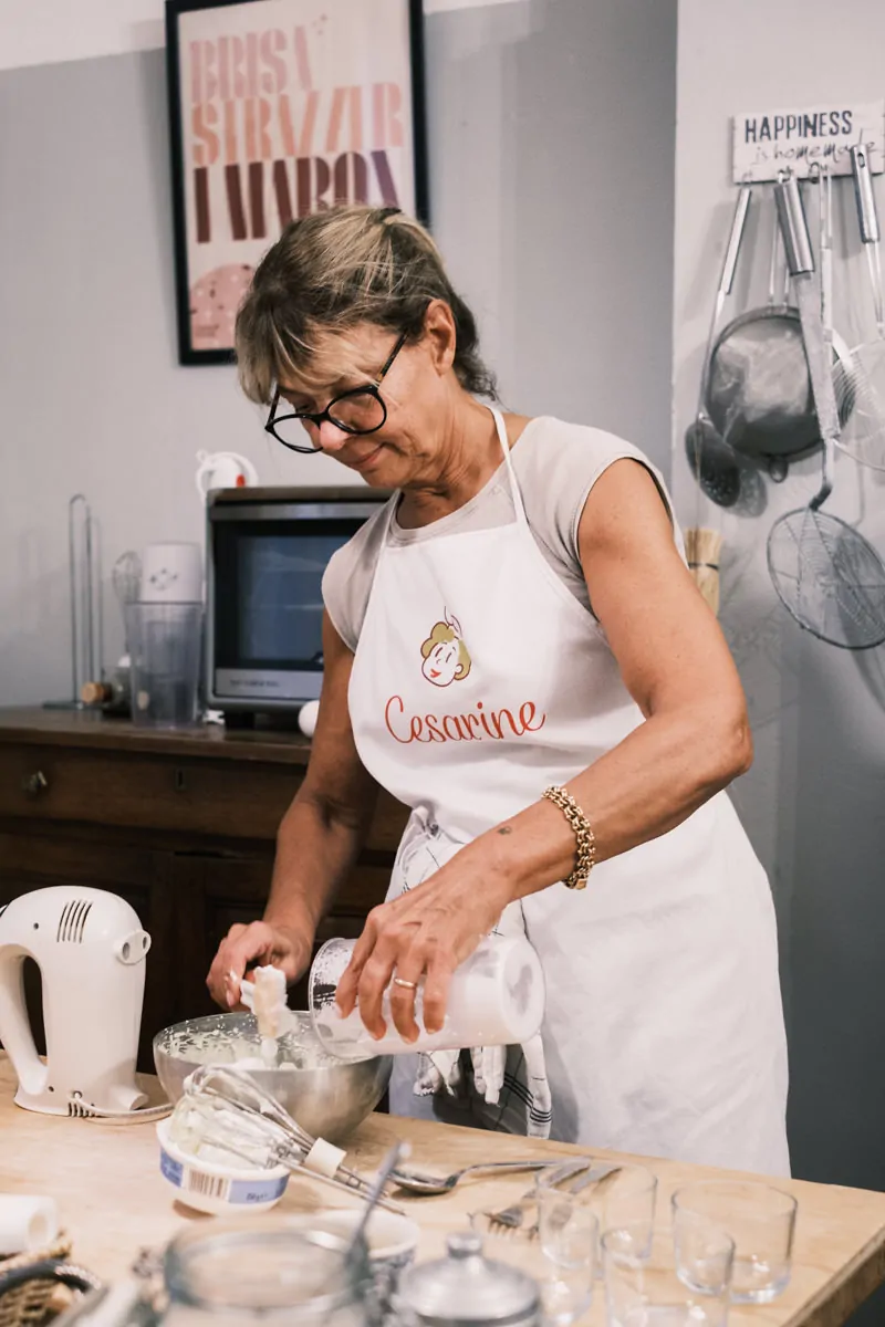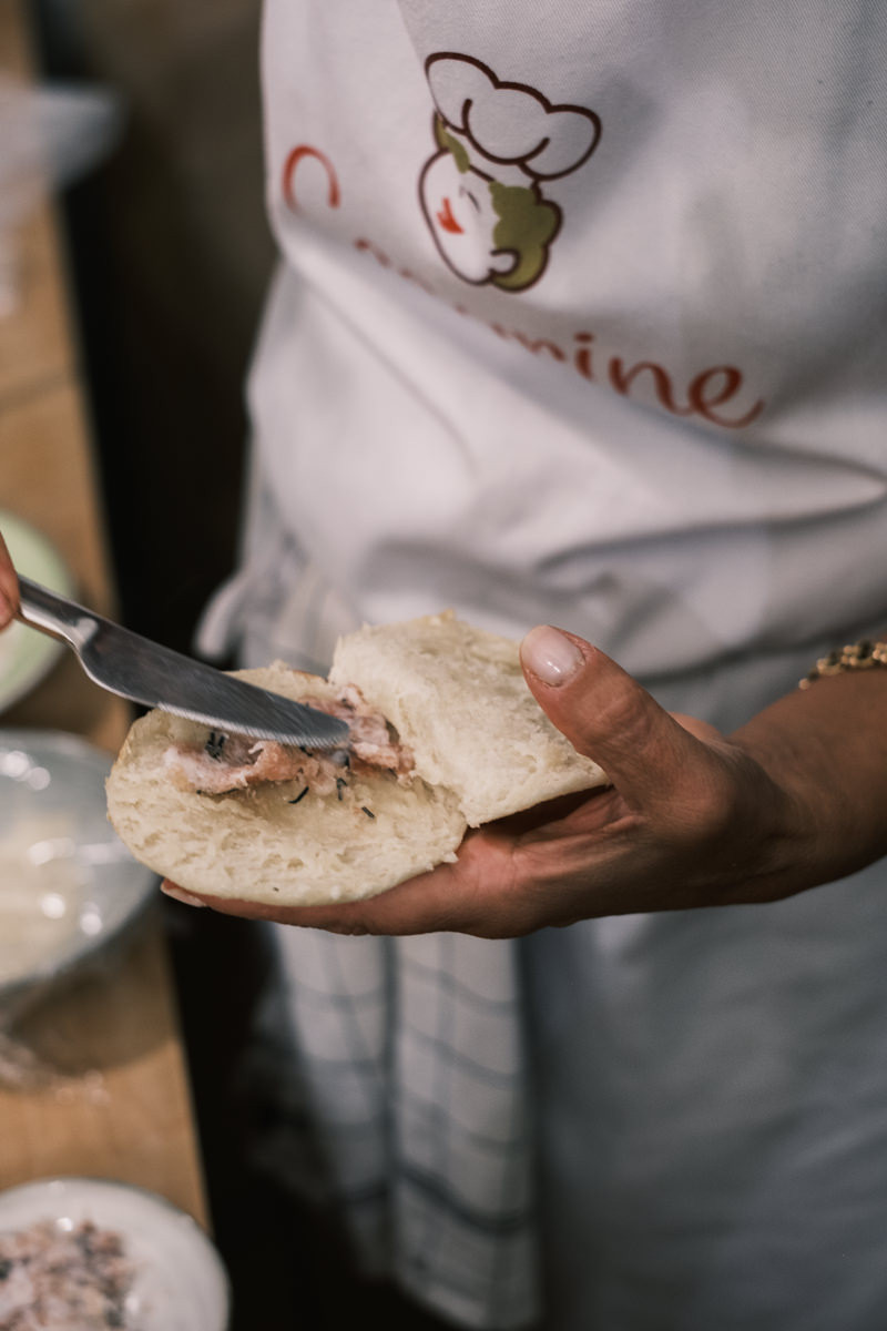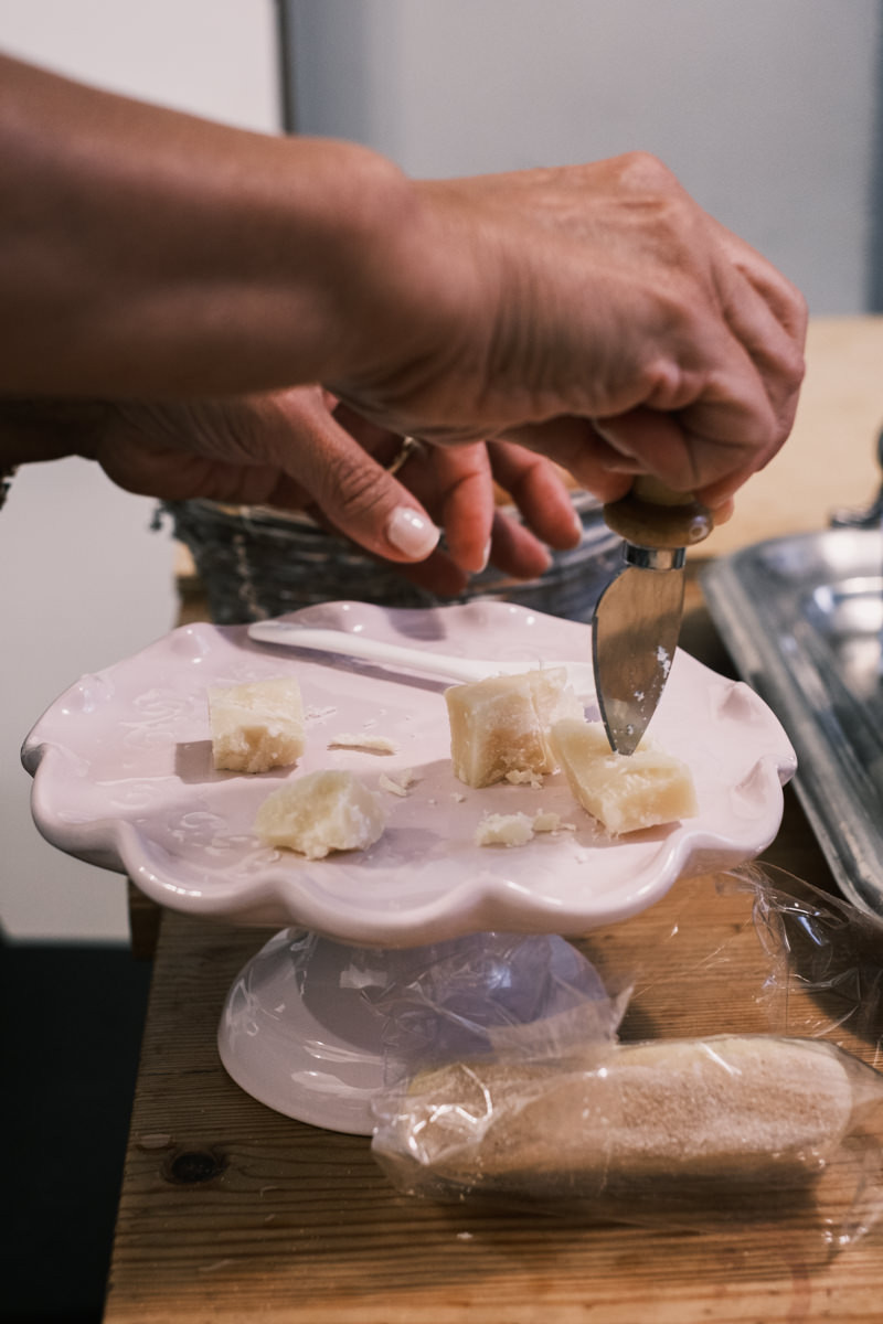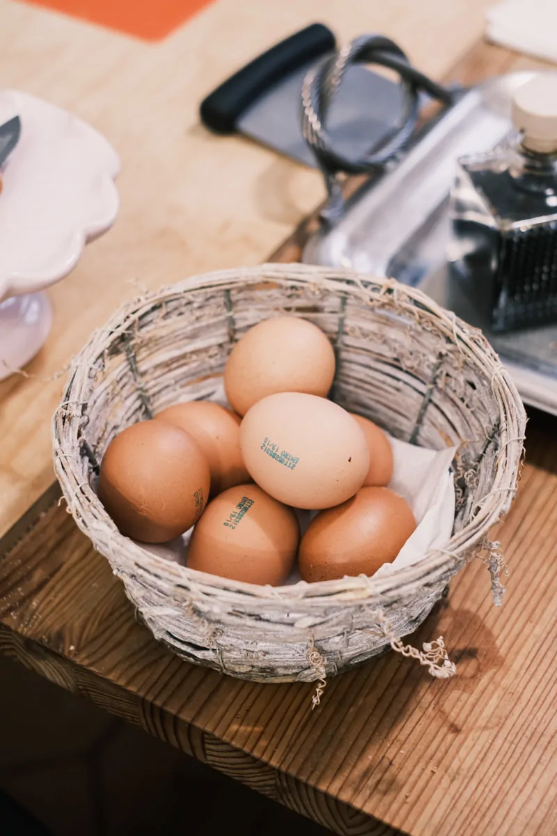 In the kitchen, bottles of oil, balsamic vinegar, and honey sat next to a basket of eggs, hand-labeled flour and sugar jars, knives, scrapers, garlic presses, sifters, and every kitchen tool you’d expect to need in for a cooking class. It looks chaotic, but everything has its own place.