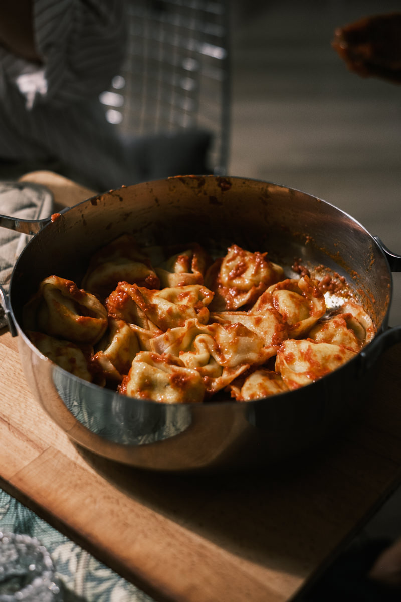 After boiling the pasta, she finishes with the dish by cooking the tagliatelle and the ragù together. The tortelloni can be served with a simple sage butter and some parmesan, but there was plenty of ragù so she prepares the cooked tortellini with the rest of it.