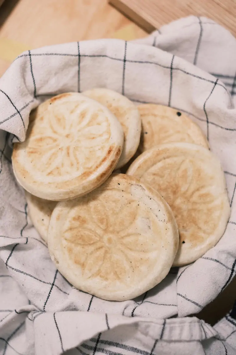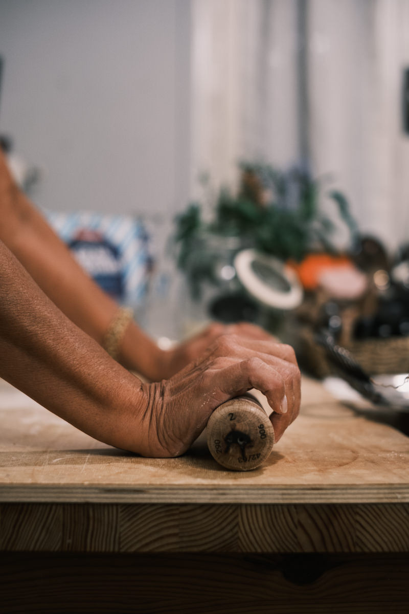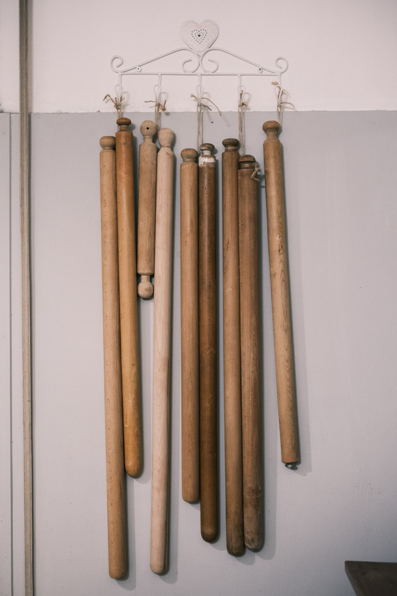 While kneading the dough, I remembered to ask about all the rolling pins on hanging from the wall. She said those were all the ‘retired’ ones that have worn and warped over time. Some have been passed down that she’s had her whole life.
