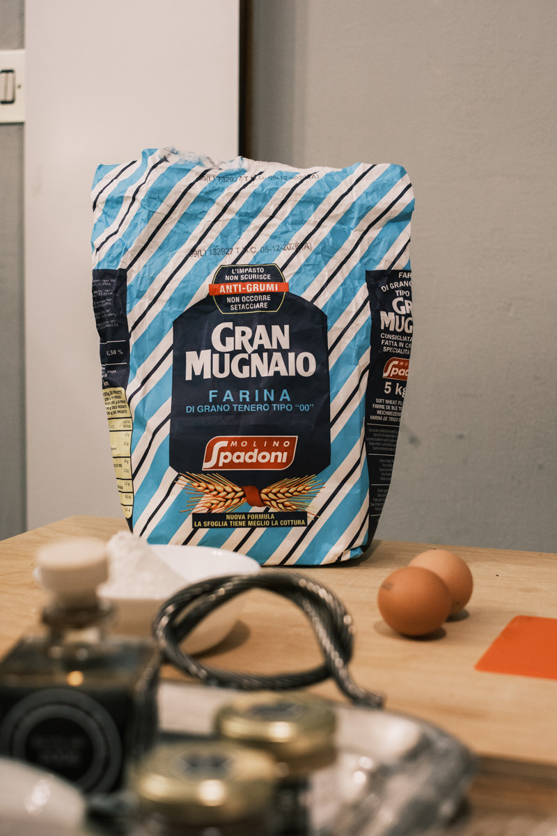 For fresh egg pasta, Cristina uses 00 soft wheat flour with a weaker protein percentage of around 8-12%. A lower protein ratio yields a more delicate and smoother dough in contrast to a chewier and more structured dough that you’d want for something like bread.