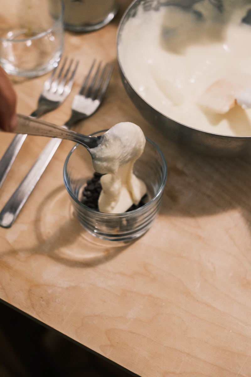 Instead of the large baking dish, she prepares them individually, breaking up the espresso-soaked savoiardi (lady fingers) to fit inside a clear dessert cup and creating two layers with the luscious cream and a dusting of cacao powder on top. She prepares a variation with chocolate chips instead of the savoiardi (lady fingers) for a gluten-free option.