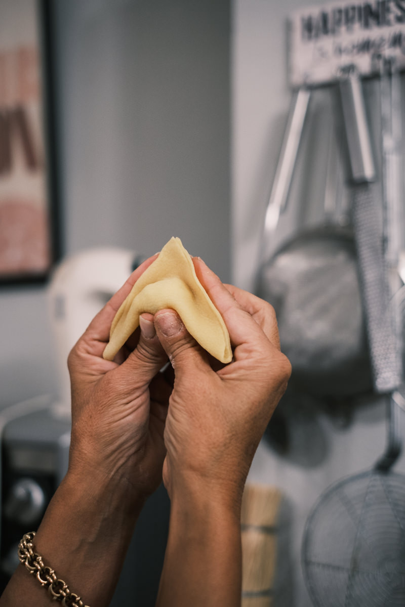 After I managed to get square pieces from my misshapened dough, we spoon in the filling prepared earlier consisting of ricotta and parmesan cheese with chopped parsley, egg, and salt. We closed and sealed each one into a triangle and then Cristina demonstrated a hold and pinch technique to get that iconic opening that’s meant to resemble the navel of Venus, the goddess of love.
