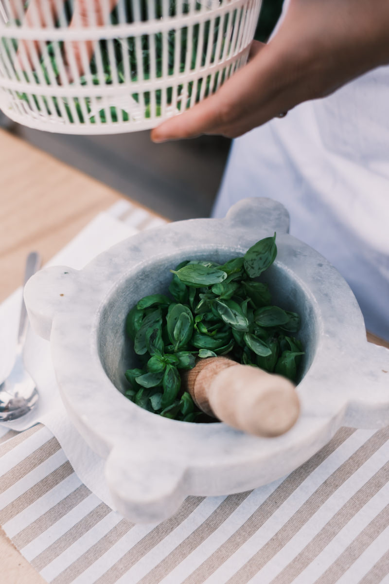 The pesto is made with a traditional mortar and pestle to break and mash the pine nuts, garlic, and basil. We pinch from the top of the bunch to get the medium to large leaves for the more robust flavor, but also to also the branches to grow back. We also harvest some of the smaller ones too because they tend to be more tender and less bitter.