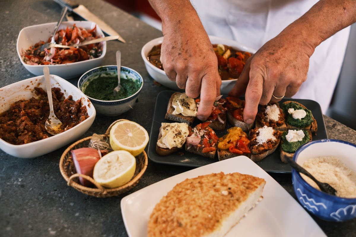 In total, he prepared five different bruschetta toppings using the freshly made tomato and onion salad, roasted peppers, roasted eggplants with parmesan, warm brie and honey, and pesto with a creamy strachiatella.