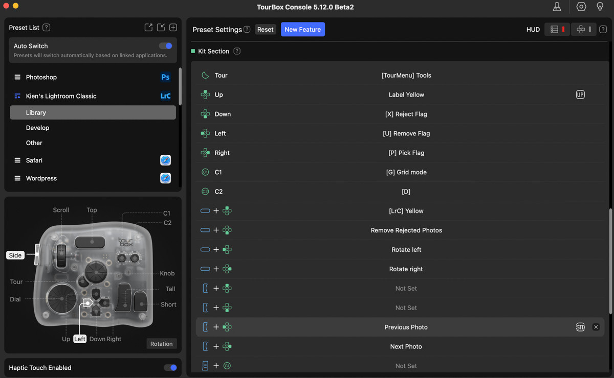 When I first started using the original TourBox, I actually created two separate presets to do exactly what the sub-presets now do, since many of today’s features and functions didn’t yet exist. It was too complicated to try to map everything, so I created a ‘Cull’ preset that focused on going through my library to make selects and rejects, and do basic exposure and contrast adjustments. When I was ready to edit, I swapped to a separate ‘Edit’ preset.