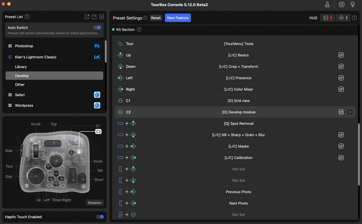 Introduced with the TourBox Console 5.10 (around October 2025), the software now allows you to create separate sub presets within programs like Adobe Lightroom and DaVinci Resolve. In other words, the Console software now recognizes when you’ve switched workspaces or modules and automatically switches you to a different sub-preset. This means you don’t need one preset that tries to do everything.